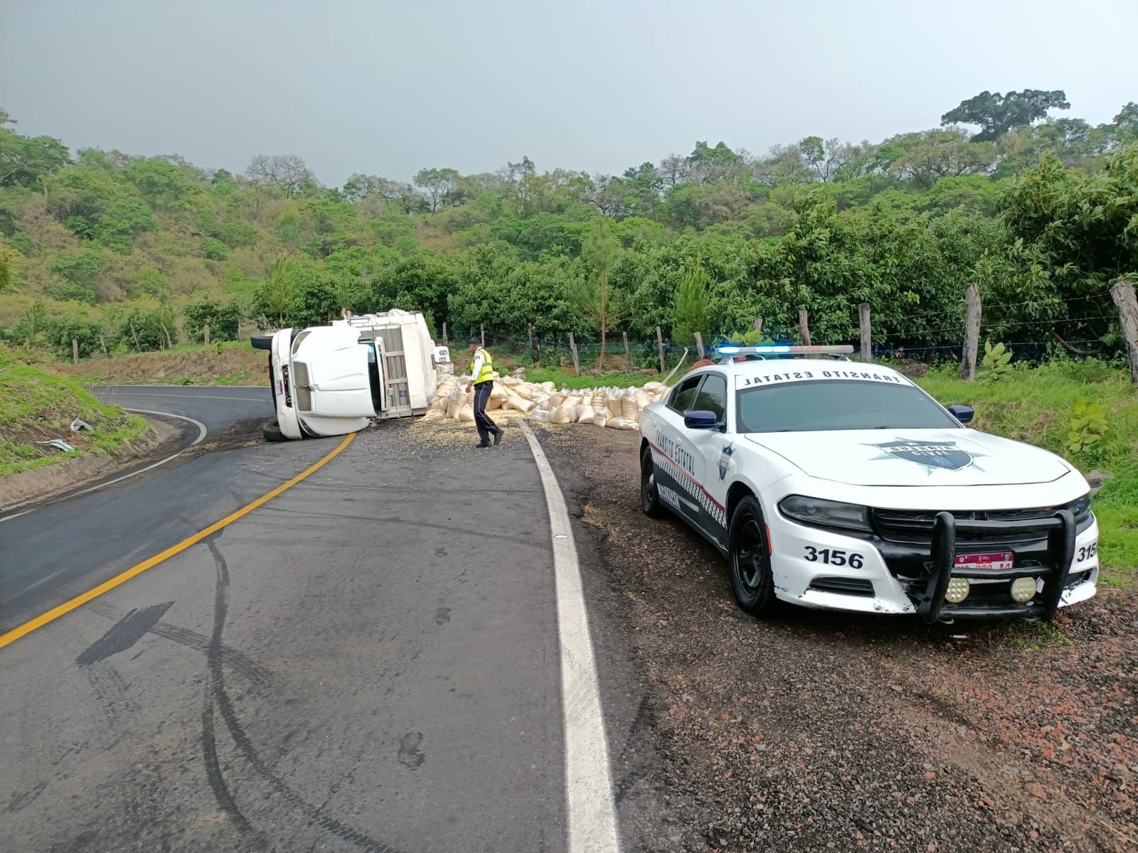 En el tramo carretero que conduce de Peribán a Buenavista, un tractocamión que transportaba maíz volcó en una curva, por lo que los agentes de vialidad acudieron a abanderar la zona, el cual después de consultar su documentación se confirmó que contaba con reporte de robo.