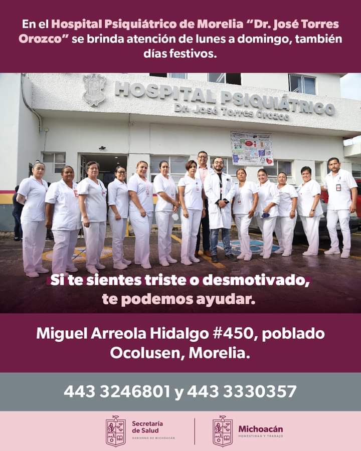 La SSM pone a disposición de la población la atención médica gratuita en el Hospital Psiquiátrico Dr. José Torres Orozco, donde se atienden este tipo de padecimientos de manera gratuita y oportuna.
