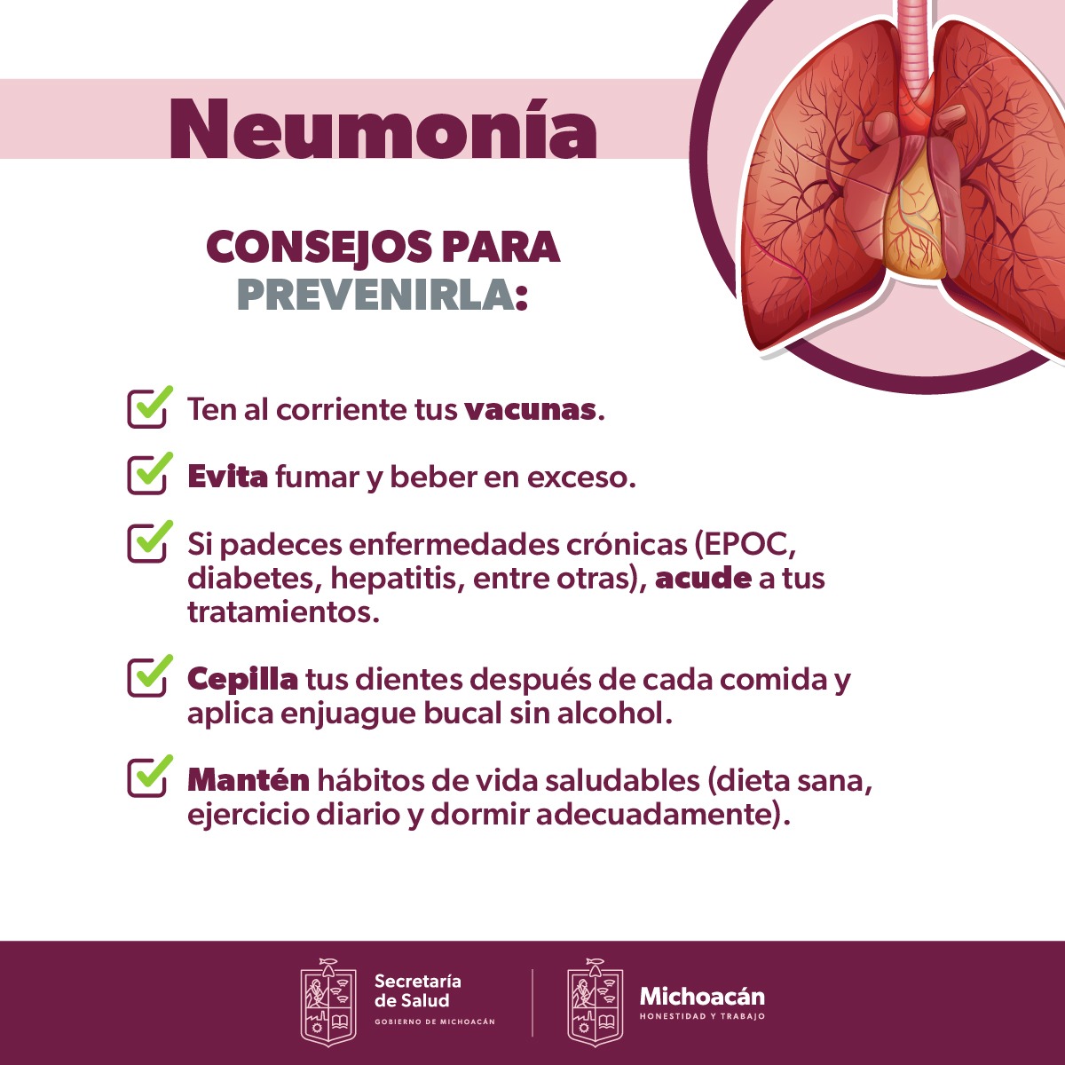 La neumonía se desarrolla como complicación de una enfermedad de las vías respiratorias mal tratada, como influenza, neumococo, bronquitis y COVID-19. Provoca insuficiencia respiratoria, fiebre superior a los 38 grados, dolor de cuerpo y hundimiento de pecho.