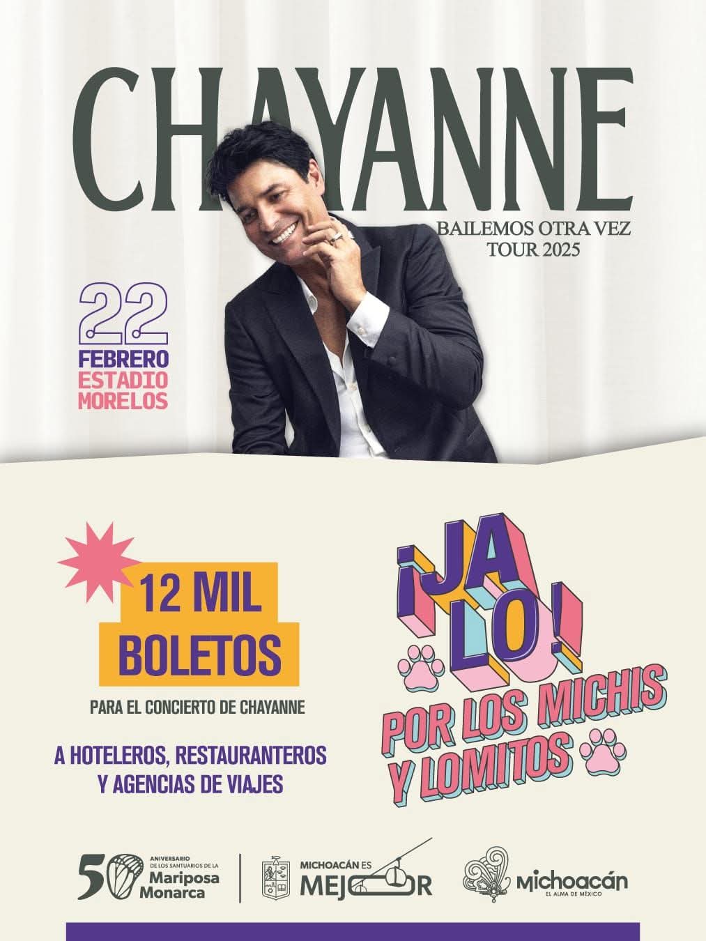 Morelia, Michoacán, 17 de Febrero de 2025.- El próximo sábado 22 de febrero la Chayannemanía se vivirá con el concierto que el puertorriqueño ofrecerá en la capital del estado, como parte de la campaña “Jalo por los michis y los lomitos”, del Gobierno de Michoacán.