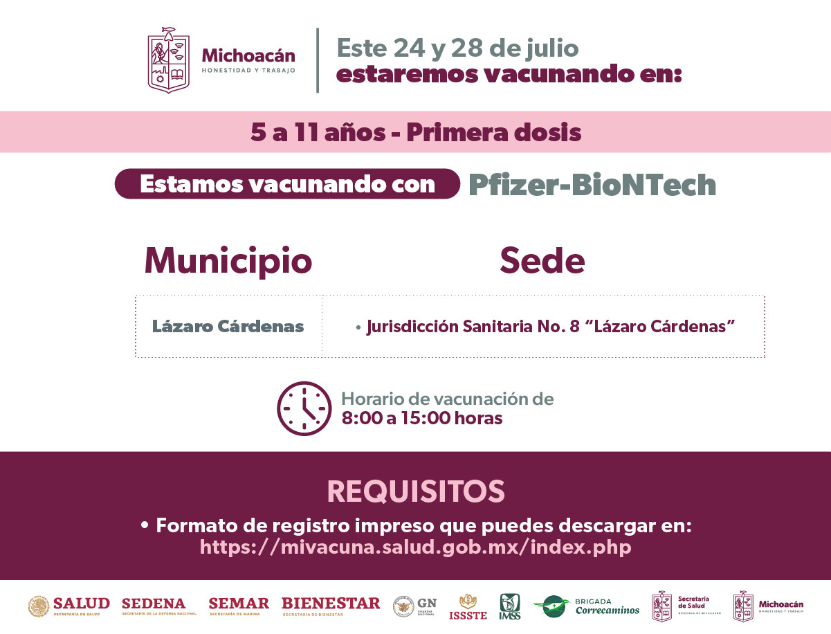 Morelia Michoacán a 22 de Julio de 2023.- La Secretaría de Salud de Michoacán (SSM) anunció las últimas fechas para la vacunación contra el COVID-19 dirigida a menores de cinco a 11 años, la cual se llevará a cabo del 24 al 28 de julio en tres municipios del estado.
