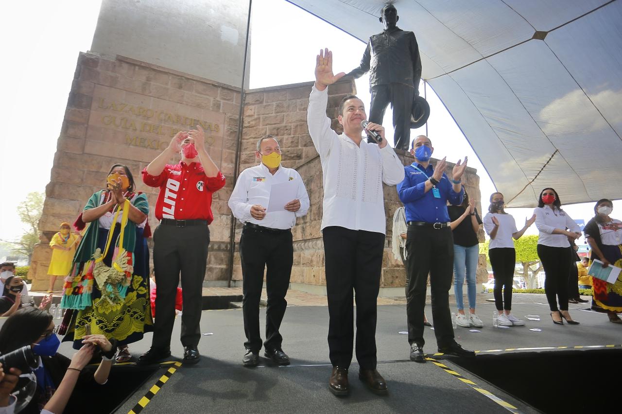 En un hecho histórico, arropado por su familia y los dirigentes nacionales Alejandro Moreno Cárdenas del PRI, Jesús Zambrano Grijalva del PRD, y Marko Cortes Mendoza del PAN, el oriundo de Zitácuaro, afirmó que la unidad alcanzada es muestra del compromiso por un mejor Michoacán.