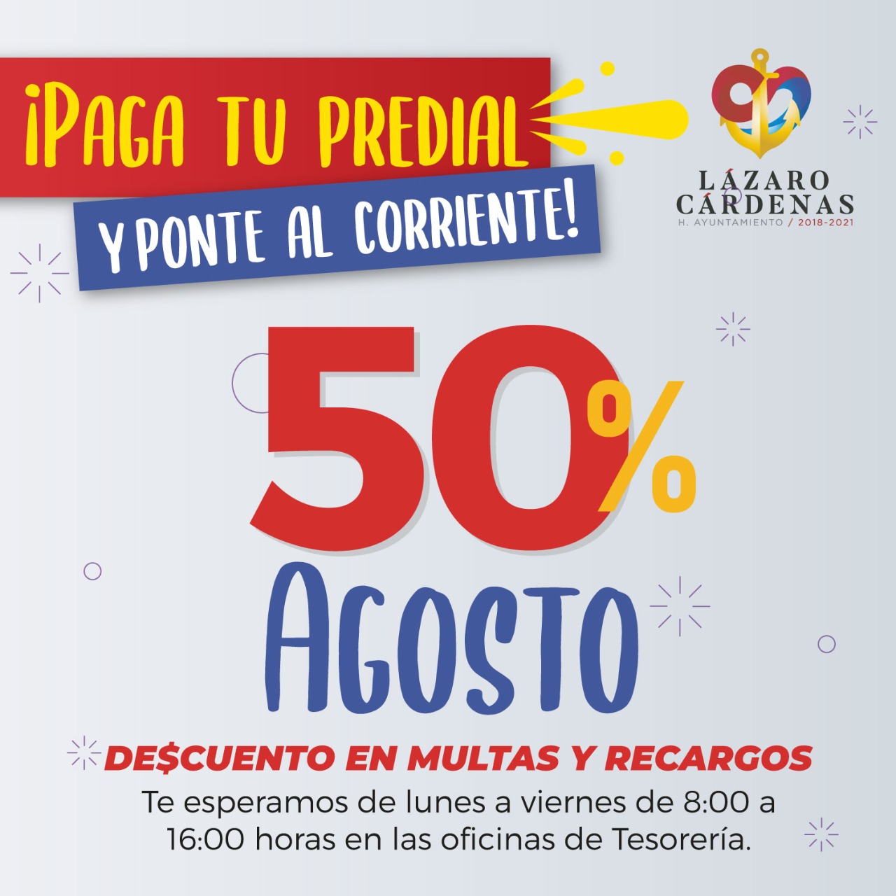 Lázaro Cárdenas, Michoacán; a 08 de Agosto de 2021.- El Gobierno Municipal de Lázaro Cárdenas informa que se mantienen vigentes los descuentos del 50 por ciento multas y recargos del impuesto predial.