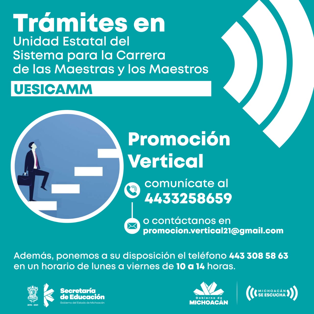 La institución, reitera el compromiso y disposición de proporcionar la información necesaria y brindar el acompañamiento a los docentes en los procesos de promoción correspondientes al ciclo escolar 2021, a través de los correos promocion.vertical21@hotmail.com y promocionhorizontal21.uesicamm@gmail.com y mediante los teléfonos 4433 25 86 59 y 4433 08 58 63.