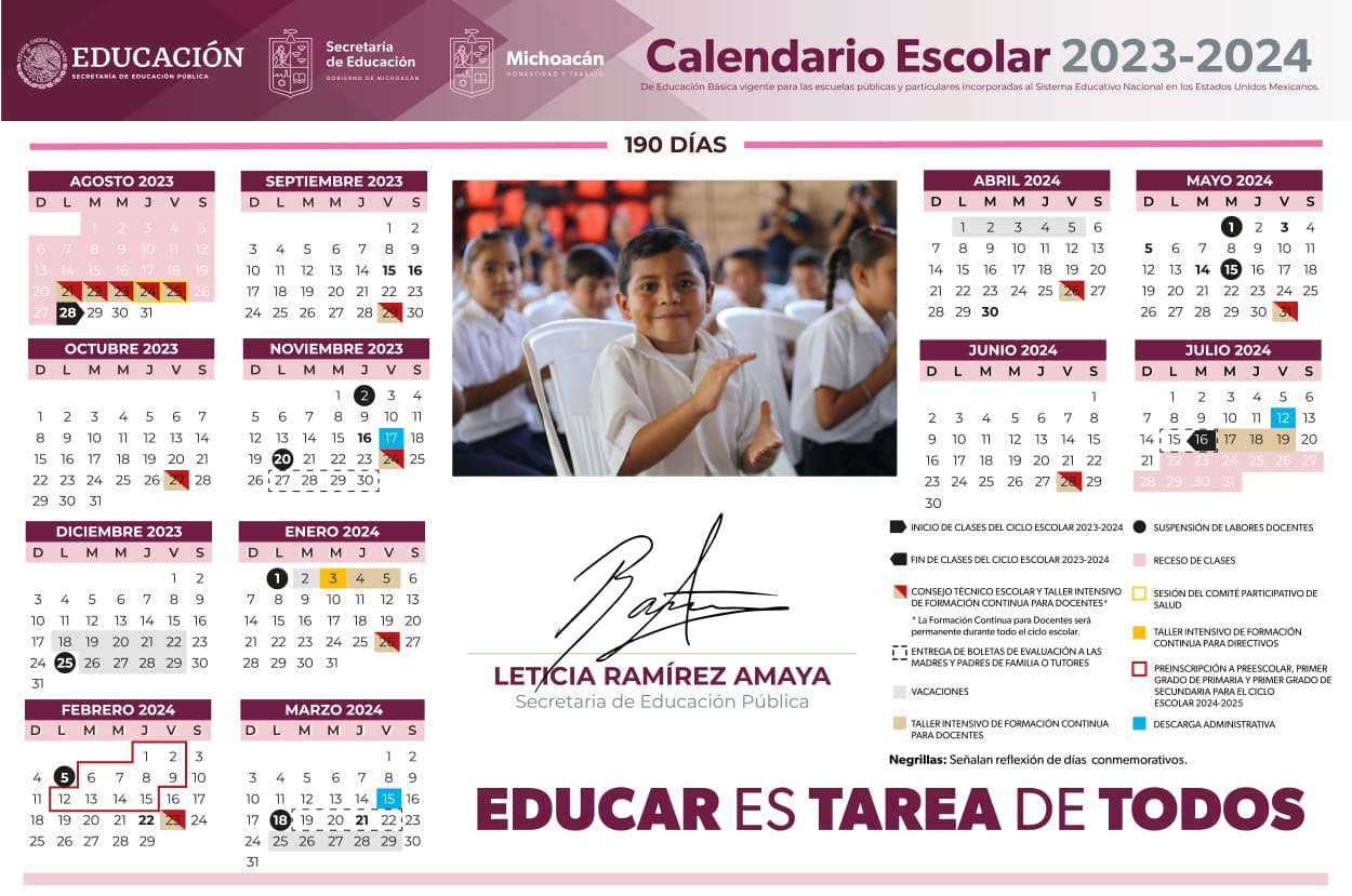 Es de mencionar que el calendario escolar 2023-2024 contempla 190 días de actividades tanto para escuelas públicas y privadas de educación básica incorporadas al Sistema Educativo Nacional; mientras que para Educación Normal y formación de maestras y maestros 195 días, incluyendo las sesiones del Consejo Técnico Escolar (CTE).