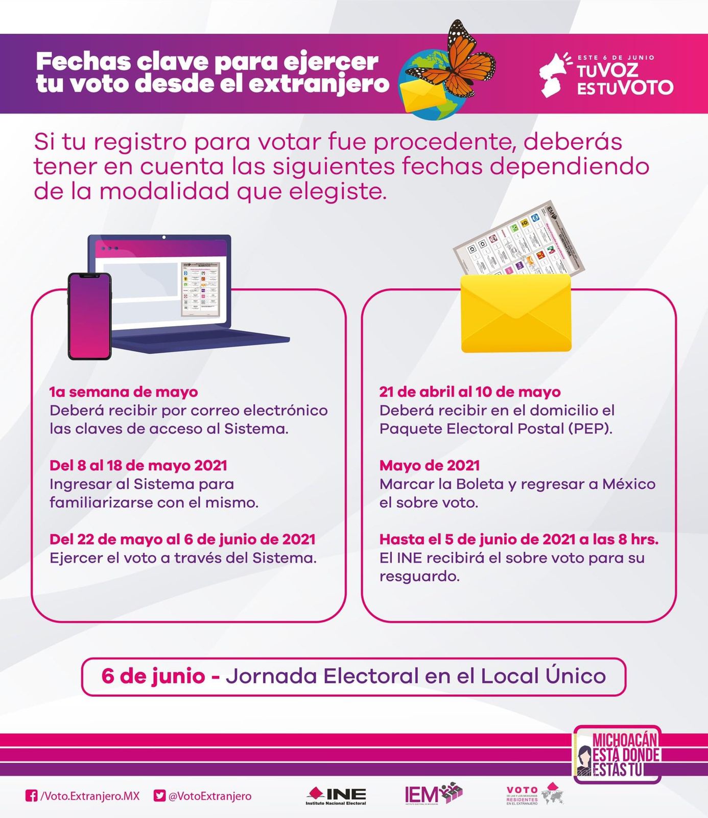 Durante el periodo de registro 3 mil 979 michoacanas y michoacanos que radican en 39 países, se inscribieron en el Listado Nominal para poder ejercer su derecho a votar desde cualquier parte fuera de México. De esa cantidad 1 mil 840 decidieron hacerlo por la vía Postal y 2 mil 139 por la vía electrónica.