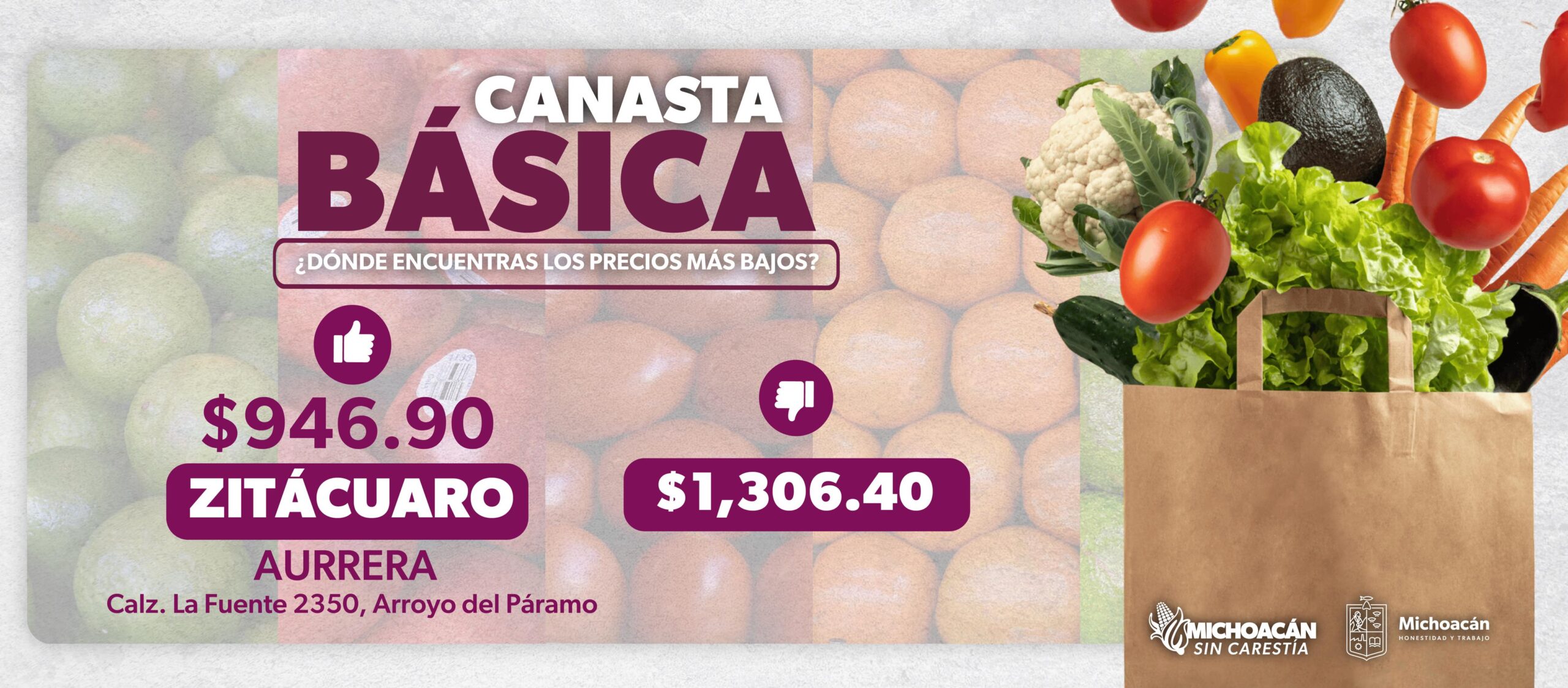 Morelia, Michoacán a 26 de junio del 2024.- Con 946 pesos el supermercado de Aurrera en Zitácuaro oferta la canasta básica más económica en el territorio estatal, costo identificado en el monitoreo semanal que realiza la Secretaría de Desarrollo Económico (Sedeco).