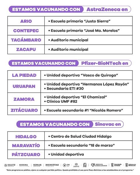 En La Piedad (Unidad deportiva “Vasco de Quiroga), Uruapan (Unidad deportiva “Hermanos López Rayón” y Secundaria ETI 30), Zamora (Unidad deportiva “El Chamizal” y la clínica UMF 82) y Zitácuaro (Escuela Secundaria No. 1 “Nicolás Romero”), se aplicará el biológico de Pfizer.