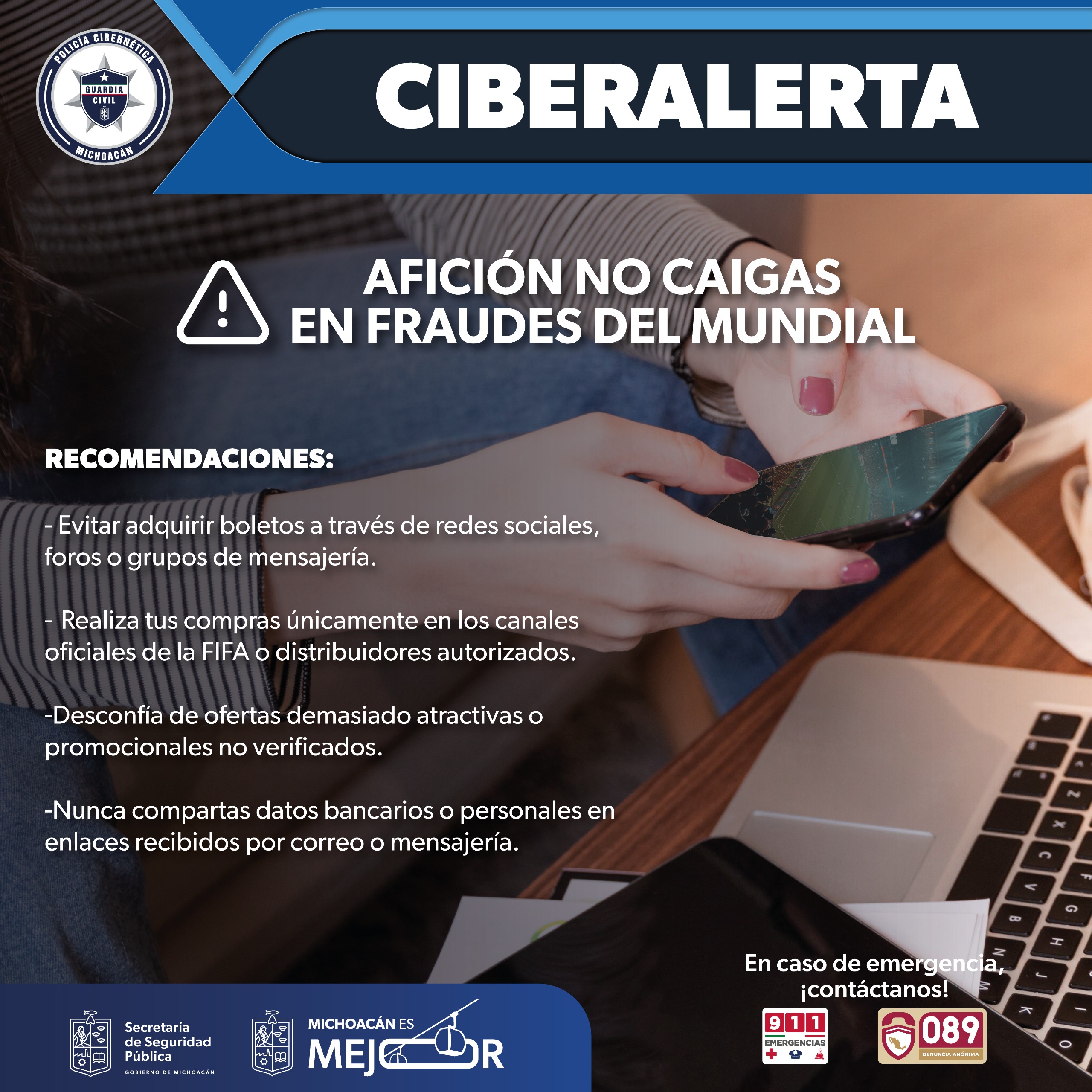 Morelia, Michoacán, 24 de septiembre de 2025.- A través de labores de cibervigilancia efectuadas por elementos de la Secretaría de Seguridad Pública (SSP), se descubrieron distintas modalidades de fraudes alusivas a la venta de boletos del Mundial de Fútbol a realizarse en México en el año 2026.