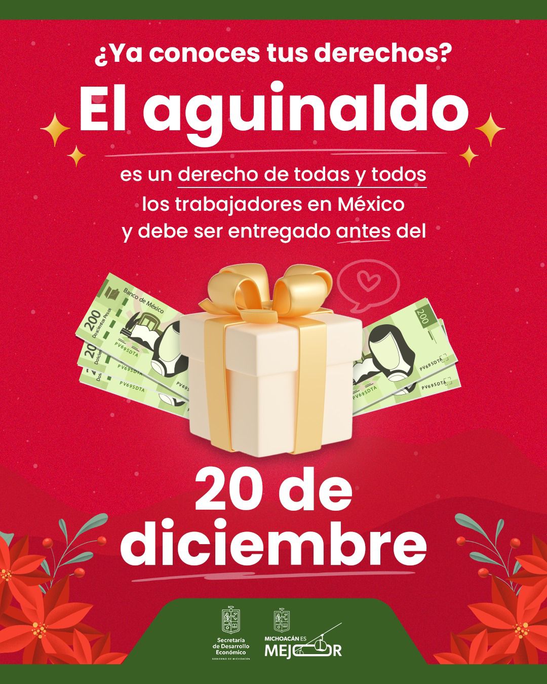 Morelia, Michoacán, 12 de diciembre de 2025.- El aguinaldo es una prestación laboral obligatoria que todas y todos los trabajadores con una relación de trabajo formal deben recibir cada año. De acuerdo con la Ley Federal del Trabajo, el 20 de diciembre es la fecha límite para que los empleadores realicen este pago, informó la Secretaría de Desarrollo Económico (Sedeco).