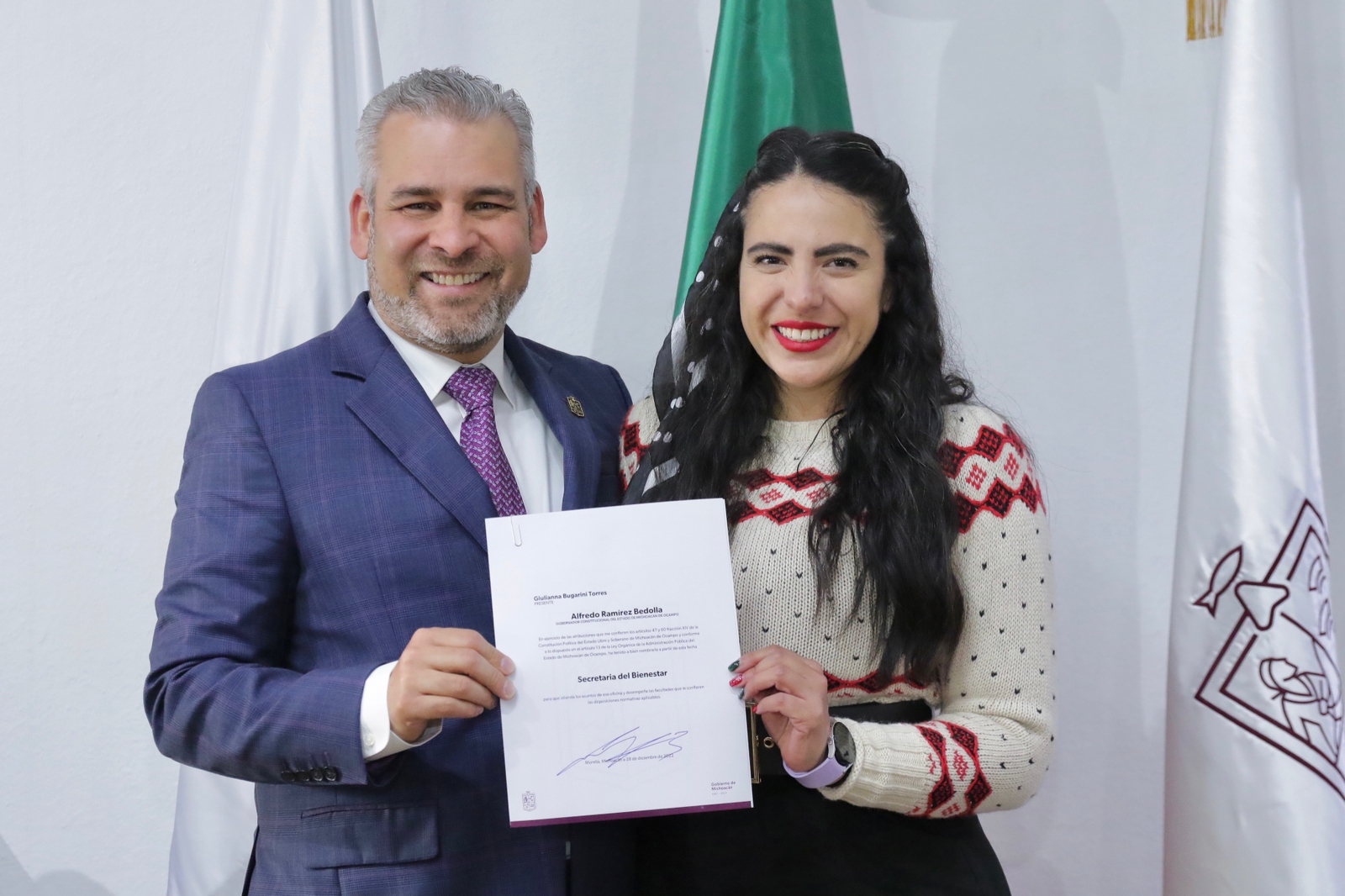 Morelia, Michoacán a 28 de Diciembre del 2022. El gobernador Alfredo Ramírez Bedolla anunció que Giulianna Bugarini Torres asume la titularidad de la Secretaría de Bienestar, y Carolina Rangel Gracida estará al frente de la Secretaría de Igualdad Sustantiva y Desarrollo de las Mujeres (Seimujer).