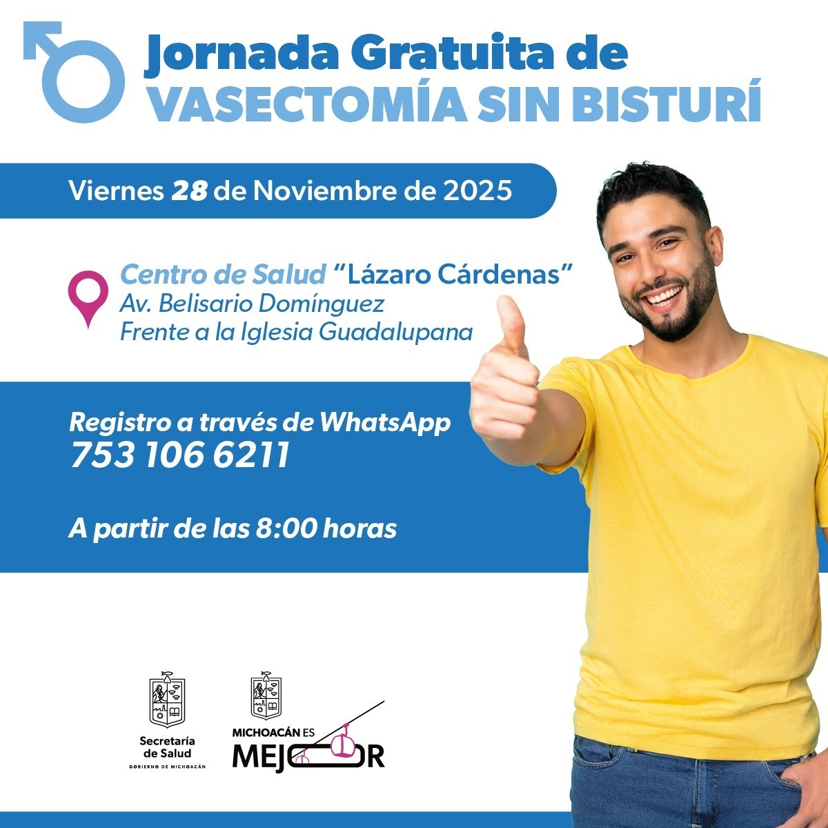 Lázaro Cárdenas, Michoacán, 21 de noviembre de 2025.- Con el objetivo de fomentar la planificación familiar y la corresponsabilidad en la salud reproductiva, la Secretaría de Salud de Michoacán (SSM) llevará a cabo una jornada gratuita de vasectomía sin bisturí en Lázaro Cárdenas.
