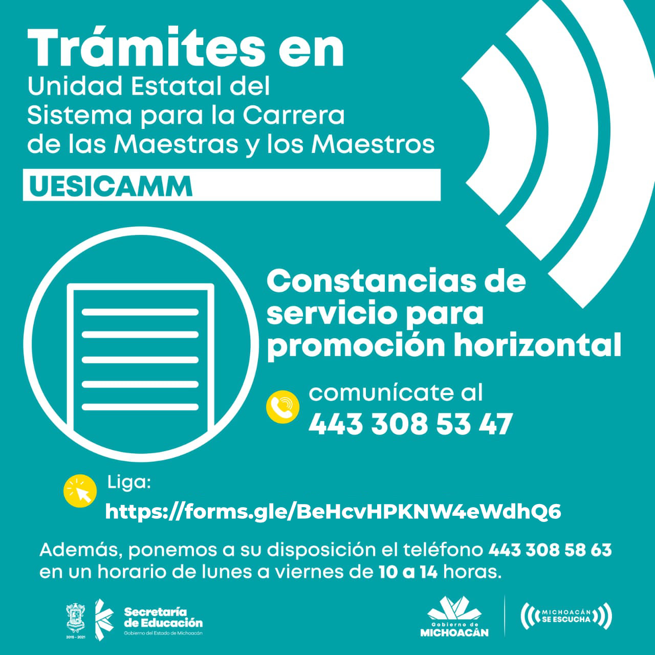 Morelia, Michoacán, a 07 de abril de 2021.- la Secretaría de Educación en el Estado (SEE) informa a las y los docentes participantes en el Proceso de Promoción Horizontal por Niveles con Incentivos ciclo 2021 – 2022, que las Constancias de Antigüedad que emite el Departamento de Control de Personal continúan enviándose de manera constante e ininterrumpida.