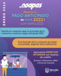 Morelia, Michoacán, a 28 de enero de 2022.- A tres días de concluir el primer mes del año, el Organismo Operador de Agua Potable, Alcantarillado y Saneamiento de Morelia (OOAPAS) informa que continúa su Programa de Pago Anticipado hasta concluir enero, para que los morelianos paguen el agua...
