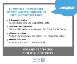 Morelia, Michoacán, a 30 de Diciembre de 2021. El Organismo Operador de Agua Potable Alcantarillado y Saneamiento de Morelia (OOAPAS) informa que este viernes 31 de diciembre estarán abiertos al público cuatro (04) módulos de pago, de 08:00 a 13:30 horas, para que los usuarios puedan acudir a...