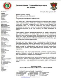 Morelia Michoacán a 30 de Agosto de 2021. El presidente de la Federación de Clubes Michoacanos en Illinois (FEDECMI) Artemio Arreola, le envió una carta de agradecimiento al Gobernador Electo Alfredo Ramírez Bedolla y a los diputados locales por el apoyo y la decisión de no cerrar la...