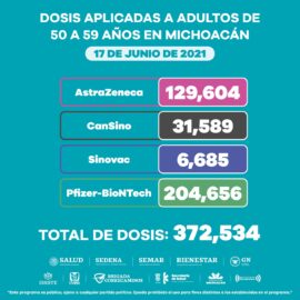 Morelia, Michoacán, a 17 de Junio de 2021.- En la entidad se han aplicado 372 mil 534 dosis de vacunas anti COVID-19 a personas de entre 50 y 59 años de edad, informó la Secretaría de Salud de Michoacán (SSM). Asimismo, el sector de la población que corresponde...