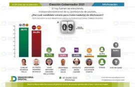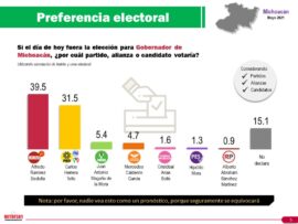 Morelia, Michoacán a 28 de Mayo de 2021.- A tan solo 9 días de la elección del 6 de junio, el candidato a la gubernatura de Equipo por Michoacán, Carlos Herrera Tello, mantiene la tendencia ganadora con el 38.1 de las preferencias electorales. La casa encuestadora Demoscopia Digital,...