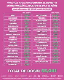 Morelia, Michoacán, a 27 de mayo de 2021.- En Michoacán, se han aplicado hasta el día de hoy 217 mil 989 dosis contra COVID-19, a hombres y mujeres de 50 a 59 años de edad, en 55 municipios. Para ello, la Secretaría de Salud de Michoacán (SSM) ha...