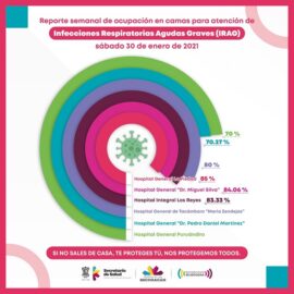Morelia, Michoacán, a 30 de Enero de 2021.- La Secretaría de Salud de Michoacán (SSM), informa sobre la ocupación de camas destinadas para la atención de Infecciones Respiratorias Agudas Graves (IRAG), en sus unidades médicas de segundo nivel. Son seis los hospitales que se encuentran por encima del...