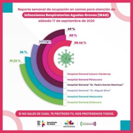 Morelia, Michoacán, a 17 de Octubre de 2020.- Derivado del comportamiento epidemiológico de COVID-19, las camas reconvertidas para la atención de infecciones Respiratorias Agudas Graves (IRAG), de seis hospitales de la Secretaría de Salud de Michoacán (SSM), registran una ocupación de entre 19 y 58.46 por ciento. Los...