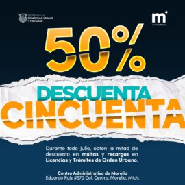 Morelia, Michoacán a 1° de julio de 2025.- Con el objetivo de apoyar a la ciudadanía y facilitar la regularización de trámites, el Gobierno de Morelia bajo las instrucciones del presidente Alfonso Martínez Alcázar, lanza “¡Descuenta 50%!”, una campaña especial de condonación de recargos y multas, que estará...