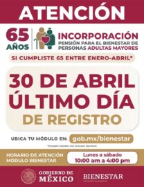 Ciudad de México, 27 de abril de 2022.- La Secretaría de Bienestar informa que este sábado 30 de abril concluye la etapa de incorporación al padrón de derechohabientes de la Pensión para el Bienestar de las Personas Adultas Mayores, que inició el pasado 18 de abril. La secretaria...