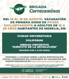 Morelia, Michoacán, a 13 de agosto de 2021.- Este lunes 16 de julio iniciará la vacunación de las primeras dosis de Pfizer-BioNTech contra COVID-19 a personas de 18 a 29 años de edad y mujeres embarazadas, en Morelia. Esta jornada de vacunación en Morelia se desarrollará los días...
