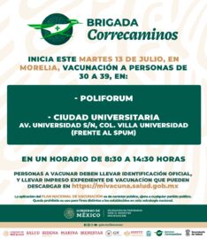 Morelia, Michoacán, a 18 de junio del 2021.- Este lunes 21 de junio, iniciará la aplicación de la primera dosis de Pfizer-BioNTech contra COVID-19 a personas de 40 a 49 años de edad y mujeres embarazadas mayores de 18 años, en Morelia. Los módulos de vacunación habilitados serán...