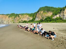 Lázaro Cárdenas, Michoacán a 27 de Octubre de 2024. Más de 100 estudiantes, así como personal docente, administrativo y directivo del Centro de Educación Media Superior a Distancia (Cemsad) Caleta de Campos, participaron en la liberación de tortugas de la especie Golfina, en el campamento tortuguero en las...