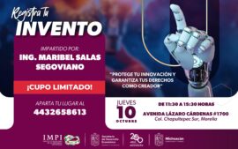 Morelia, Michoacán, 18 de Septiembre de 2024.- Si tienes un invento o una idea innovadora, el Instituto Mexicano de la Propiedad Industrial (IMPI) y la Secretaría de Desarrollo Económico (Sedeco) te dicen cómo proteger tu invención en una capacitación gratuita. La capacitación dirigida a todo el público será...