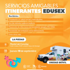 Morelia, Michoacán, 18 de Septiembre de 2024.- El jueves 19 de septiembre, la Secretaría de Salud de Michoacán (SSM) llevará su unidad móvil Edusex a escuelas de La Piedad, para ofrecer orientación, consejería y métodos anticonceptivos a estudiantes, para prevenir infecciones de transmisión sexual y embarazos no planificados....