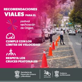 Morelia, Michoacán, 7 de Mayo de 2024.- El respeto a las personas peatonas y a sus espacios es fundamental, por ello la Secretaría de Desarrollo Urbano y Movilidad (Sedum) ofrece una serie de recomendaciones a la hora de transitar en las inmediaciones del Festival Michoacán de Origen. Cumplir...