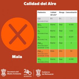 Morelia, Michoacán, 7 de Mayo de 2024.- La Secretaría del Medio Ambiente (Secma) reporta este martes una mala calidad del aire en Morelia, de acuerdo con datos del Sistema Nacional de Información de Calidad del Aire (Sinaica). La estación de monitoreo ubicada en el Centro Histórico de la...