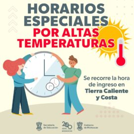 Morelia, Michoacán a 19 de Abril de 2024. Ante las altas temperaturas, la Secretaría de Educación del Estado (SEE) informa que se recorrerán los horarios de entrada en escuelas de nivel básico que se ubican en municipios de las regiones Costa y Tierra Caliente. En 25 municipios de...