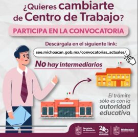 Morelia, Michoacán, 23 de febrero de 2024.- La Secretaría de Educación del Estado (SEE) informa que las y los maestros interesados pueden participar todavía en la convocatoria para Cambios de Centro de Trabajo (CCT), haciendo su solicitud de forma digital, transparente, segura y sin intermediarios. Para ello, es...