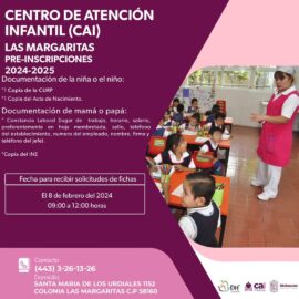 Morelia, Michoacán a 05 de Febrero de 2024. Los siete Centros de Atención Infantil (CAI) del Sistema DIF Michoacán, ubicados en Morelia y Lázaro Cárdenas, abrirán su periodo de inscripciones 2024-2025, los días 7 y 8 de febrero. El director general del organismo estatal, Óscar Celis Silva,...