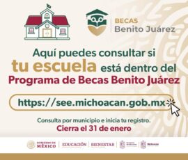 Morelia, Michoacán a 23 de Enero de 2024.- La Secretaría de Educación del Estado (SEE) puso a disposición la lista de escuelas contempladas en el programa Becas para el Bienestar Benito Juárez, que beneficiará este año a 326 mil familias michoacanas, informó la titular de la dependencia, Gabriela...