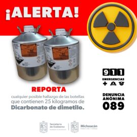 Morelia, Michoacán, 15 de enero de 2024.- El Gobierno de Michoacán, a través de la Coordinación Estatal de Protección Civil, pide a la población estar en alerta y reportar cualquier posible hallazgo de dos botellas que contienen 25 kilogramos de dicarbonato de dimetilo. Esto se da seguimiento a...