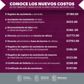 Morelia, Michoacán, 7 de enero de 2024.- La Secretaría de Gobierno informa los precios que tendrán los trámites y servicios del Registro Civil para este año, de acuerdo a la Ley de Ingresos del Estado de Michoacán. Las certificaciones de actas de nacimiento costarán 157 pesos; las actas...