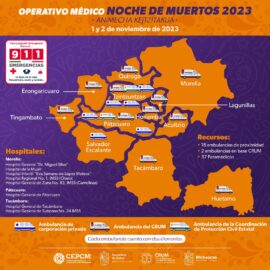 Morelia, Michoacán a 01 de Noviembre de 2023.- Para brindar servicios de emergencia, atención médica y primeros auxilios a los visitantes que arriban al estado, a la celebración de Noche de Muertos, la Secretaría de Salud de Michoacán (SSM) desplegó 21 ambulancias a las zonas turísticas de la...