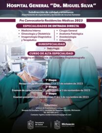Morelia, Michoacán a 23 de Octubre de 2023.- La Secretaría de Salud de Michoacán (SSM) abrió la recepción de documentos para ingresar a una de las residencias médicas de especialidad y subespecialidad de los hospitales General Dr. Miguel Silva, Infantil Eva Sámano de López Mateos, y de la...