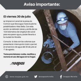 Morelia, Michoacán; a 29 de julio 2021.-Este viernes 30 de julio personal del Organismo Operador de Agua Potable, Alcantarillado y Saneamiento de Morelia (OOAPAS) dará mantenimiento al canal de la presa de Cointzio, que es de donde se envía agua a la Planta Potabilizadora de Santa María para...