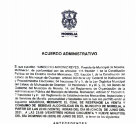 Morelia, Michoacán; a 03 de Junio del 2021.- El Gobierno de Morelia a fin de brindar las condiciones para una jornada electoral 2021 con seguridad y orden, decidió restringir la venta y consumo de bebidas alcohólicas en el municipio a partir de las 20:00 horas del sábado 05 de...