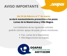 Morelia, Michoacán, a 23 de febrero de 2021.- Como parte del programa integral de mantenimiento a los pozos y equipos de bombeo, el Organismo Operador de Agua Potable, Alcantarillado y Saneamiento de Morelia (OOAPAS) hará una rehabilitación integral en los pozos que abastecen a las colonias Lomas de...