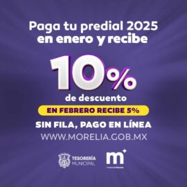 Morelia, Michoacán 09 de Enero de 2025. – Con el fin de apoyar el pago puntual de los ciudadanos, el Gobierno de Morelia informa que sigue vigente y aún se puede aprovechar el 10 por ciento de descuento en la contribución municipal del Predial 2025, el cual se...