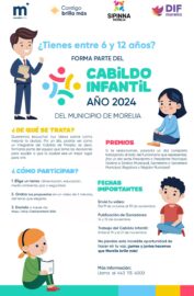 Morelia, Michoacán; 11 de Octubre de 2024 – El Gobierno del Presidente Municipal Alfonso Martínez Alcázar, a través del DIF Morelia, que encabeza la Presidenta Honoraria, Paola Delgadillo Hernández, invita a las niñas y niños morelianos de entre 6 y 12 años a integrarse al “Cabildo Infantil 2024”,...