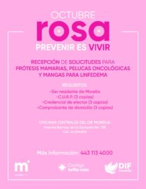 Morelia, Michoacán 9 de Octubre de 2024. – El DIF Morelia, que encabeza la Presidenta Honoraria, Paola Delgadillo Hernández, ha abierto la recepción de solicitudes para la entrega gratuita de prótesis mamarias, pelucas oncológicas y mangas para linfedema durante el mes de octubre, con el objetivo de apoyar...