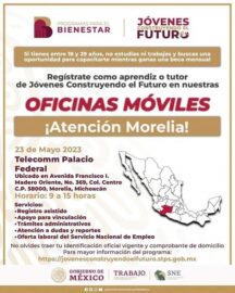 Ciudad de México a 22 de Mayo de 2023. El Gobierno de México, a través de la Secretaría del Trabajo y Previsión Social en coordinación con la Delegación de Bienestar en Michoacán, llevará a cabo la instalación de Oficinas Móviles en Morelia y Cuitzeo del programa Jóvenes Construyendo...