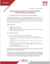 Morelia Michoacán a 01 de Junio de 2023. El Instituto del Fondo Nacional de la Vivienda para los Trabajadores (Infonavit) realizará una Feria de Soluciones de Pago en Michoacán, con el objetivo de brindar las alternativas de pago que tienen las y los acreditados que enfrentan dificultades para...